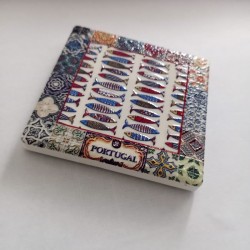 The magnet's frame is equally special, composed of small squares of traditional Portuguese tiles with various patterns, in shades of blue, white, orange and red, which harmoniously complement the central theme. At the bottom, an embossed plaque displays the word "PORTUGAL", solidifying its origin. This magnet is not only a decorative piece, but a celebration of Portuguese culture and cuisine, with the sardine being one of its most beloved icons.